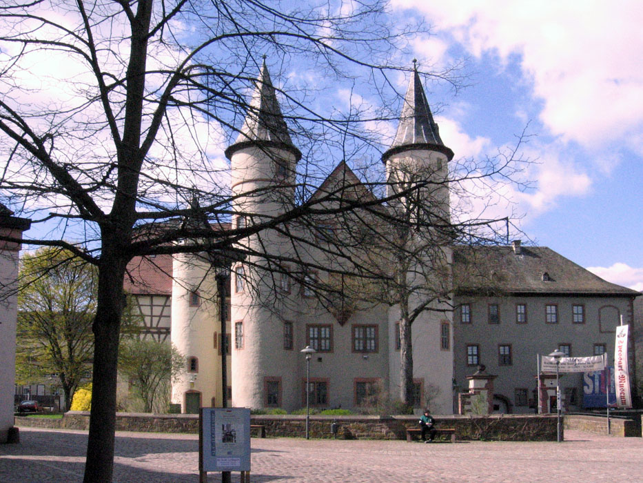 Lohr am Main - das Spessarttor . Um 1330 bis 1385 erbauten sich die Grafen von Rieneck an der Nordwestecke der Altstadt ein stattliches Schloss. Es war einst mit einem Wassergraben und einem Mauerring umgeben. Direkt dabei standen im naeheren Bereich Bandhaus, Forsthaus, Remise und Kellereigebaeuden. Seit 1972 beherbergt es das Spessartmuseum. .