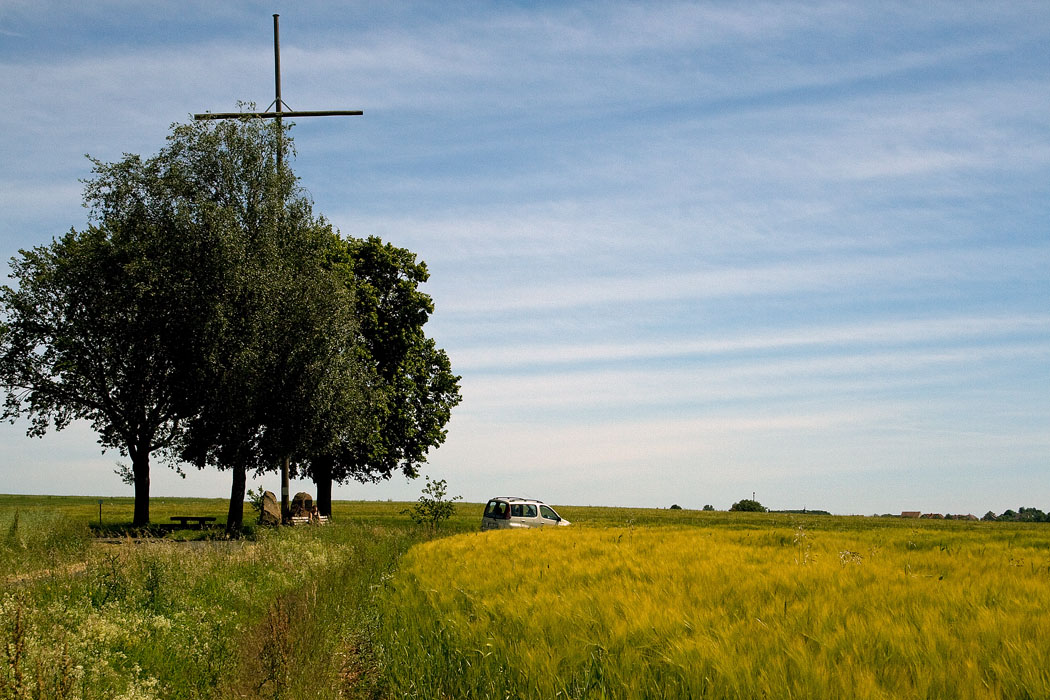 Am Flurkreuz am Dreimaerker bei Wartmannsroth - An diesem Kreuz stossen die drei Gemarkungen von Wartmannsroth, Volkersleier und Schwaerzelbach zusammen. Von hier ist eine ausgezeichnete Aussicht auf die suedliche Rhoen und den Spessart im Westen gegeben. -