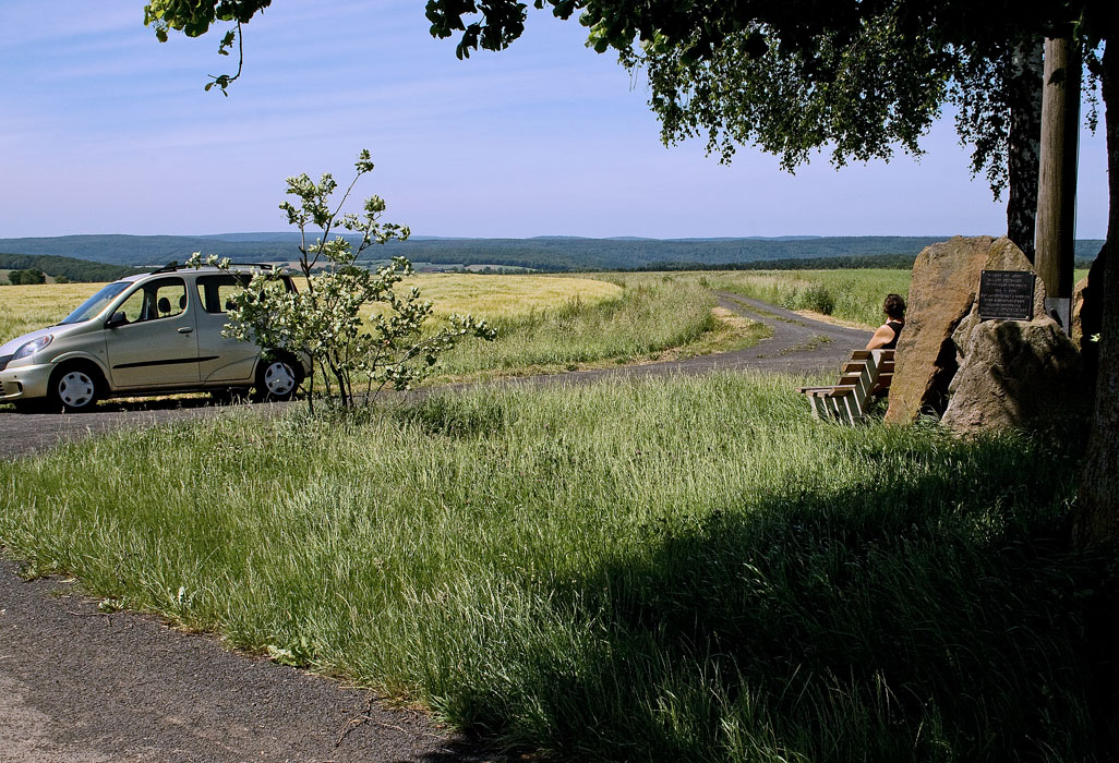 Am Flurkreuz am Dreimaerker bei Wartmannsroth - An diesem Kreuz stossen die drei Gemarkungen von Wartmannsroth, Volkersleier und Schwaerzelbach zusammen. Von hier ist eine ausgezeichnete Aussicht auf die suedliche Rhoen und den Spessart im Westen gegeben. -