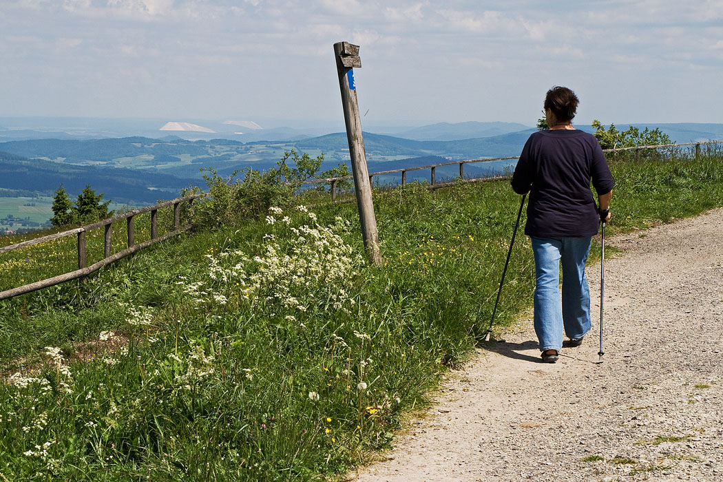 Auf der Wasserkuppe - Blick nach Norden, die 'Monte Kali' bei Philippsthal und, dahinter, bei Heringen - Der 'Monte Kali' bei Philippsthal (Werra, ca.37km von der Wasserkuppe entfernt), eine Abraumhalde des Kalibergbaus - Der Kalibergbau entstand 1905 in Philippsthal - Der Fuss der Halde liegt auf ca - 280m ueNN, ihr oberster Grat ist ca - 200m hoeher. - Mit Monte Kali (bei Heringen, Werra, ca. 45km von der Wasserkuppe entfernt) oder Kalimandscharo wird umgangssprachlich eine Abraumhalde des Kalibergbaus bezeichnet - Die Erhebung, deren Gipfelplateau sich auf einer Hoehe von 530 m ue - NHN befindet, wird heute auch als Touristenattraktion genutzt - Der Berg besteht aus etwa 150 Millionen Tonnen aufgeschuetteten Abraumsalzes - Der Monte Kali hat eine Flaeche von 55 Hektar und waechst pro Tag um knapp 20.000 Tonnen an - Die Aufschuettung begann 1973 - Die Hoehe vom Fuss des Berges bis zum Gipfelplateau betraegt knapp 200 m. -
