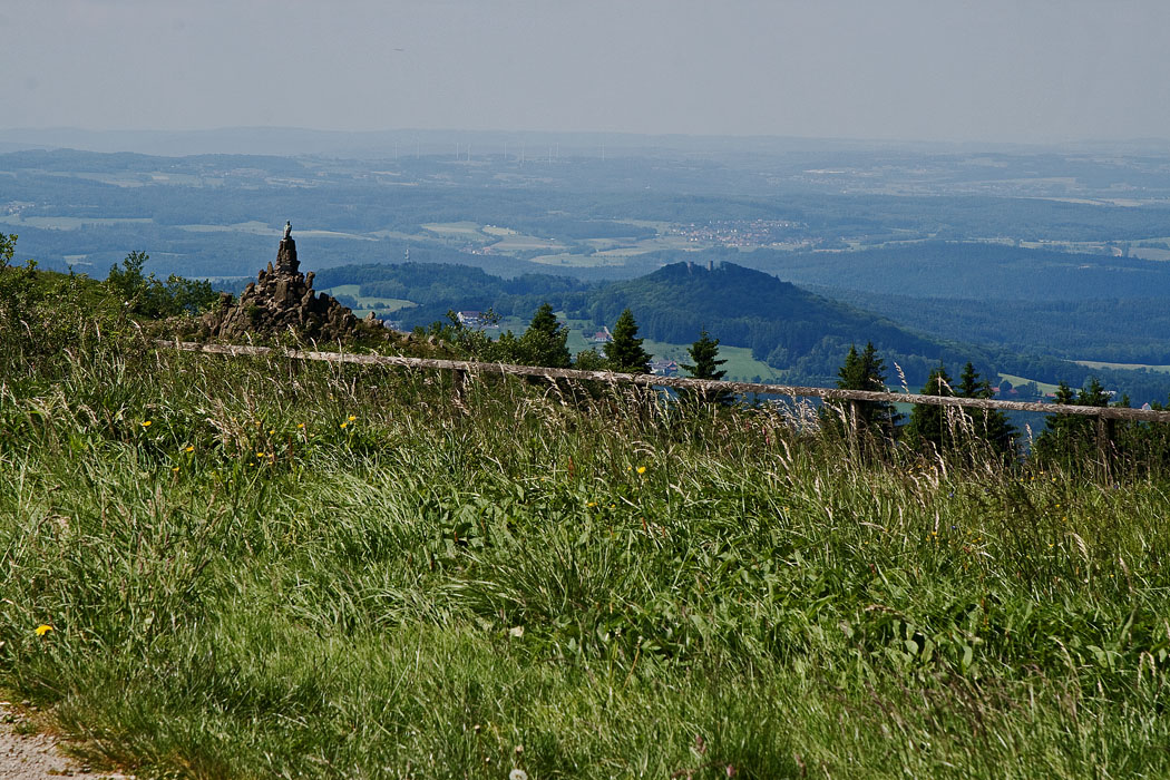 Auf der Wasserkuppe - das Fliegerdenkmal, rechts dahinter die Burgruine Ebersburg (689 m ueNN) bei Rabennest (600 m ueNN) - Das Fliegerdenkmal auf der Wasserkuppe in der Rhoen wurde 1923 errichtet und erinnert an die im Ersten Weltkrieg (1914-1918) gefallenen Feldpiloten - Es wird oft faelschlich fuer ein Denkmal an alle verstorbenen Flieger gehalten - Das Fliegerdenkmal steht am Westhang der Wasserkuppe oberhalb von Abtsroda - Es wurde errichtet auf einem Vulkanschlot, frueher Lerchenhuegel, spaeter 'Loessl Steine' genannt - Carl Oskar Ursinus hatte diesen Ort fuer eine jaehrliche Gedenkfeier bestimmt, da waehrend des ersten Rhoenwettbewerbs Eugen von Loessl am 9 - August 1920 von hier zu seinem letzten Flug gestartet war - Am 14 - August 1921 starb hier auch der Weltkriegspilot Wilhelm Leusch, der zweite Tote des Segelflugs, durch Flaechenbruch aufgrund einer Fehlkonstruktion seines Segelflugzeuges 'Weltensegler' - Die Adlerskulptur auf dem Fliegerdenkmal wurde urspruenglich fuer die Toreinfahrt der Villa von Albert Ballin, dem Generaldirektor der HAPAG, in Hamburg geschaffen (seine Witwe vermachte die Plastik dem Geschaeftsfuehrer des 'Ring der Flieger e - V.') - Zwei weitere Exemplare befinden sich in der Hamburger Kunsthalle und der Nationalgalerie Berlin - Gegossen wurde sie in der Kunstgiesserei Noack in Berlin - Nach dem Zweiten Weltkrieg war der Adler wahrscheinlich Zielscheibe der Besatzungssoldaten - Bei einer Instandsetzung durch die Fuldaer Firma Pfeifer (1954) wurden 68 Durchschuesse geflickt.