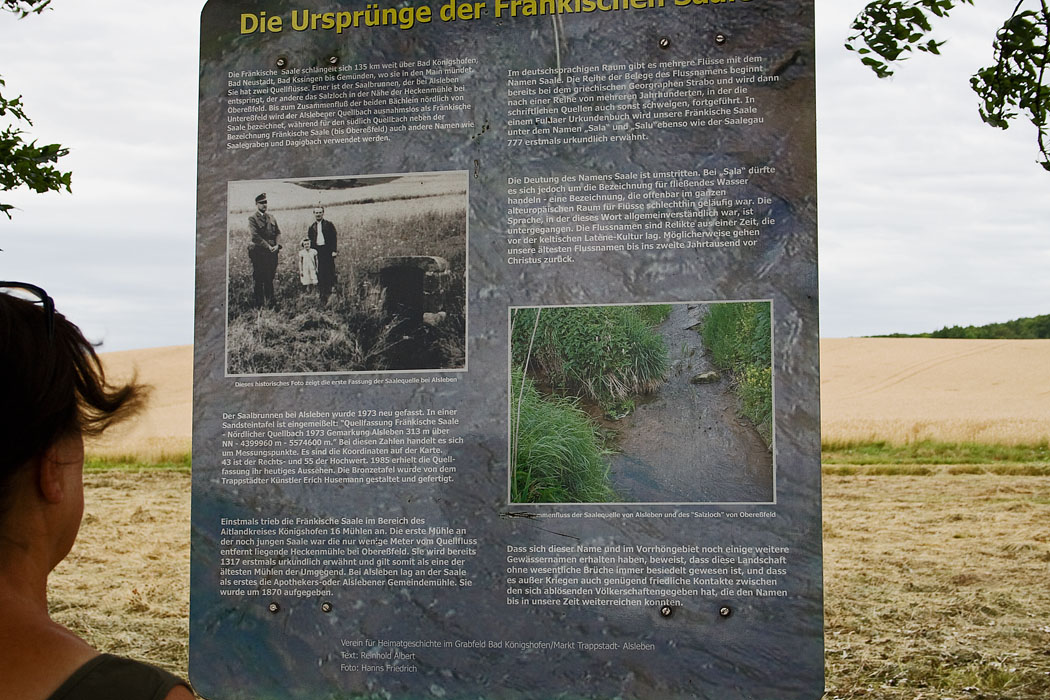 Die Quelle der Fraenkischen Saale - Info-Tafel zur Fraenkischen Saale Die Fraenkische Saale ist ein rund 135 Kilometer langer, rechter bzw. nordoestlicher Zufluss des Mains in Unterfranken. Sie entsteht im Grabfeld oestlich bzw. suedoestlich von Bad Koenigshofen aus zwei Quellbaechen. Ihr noerdlicher Quellbach entspringt im Saalbrunnen 1,7 Kilometer oestlich von Alsleben (einem Ortsteil von Trappstadt) an der Strasse nach Gompertshausen unterhalb des 390 Meter ue. NN hohen Kapellenbergs auf 313 Meter ue. NN. Die erste aus Sandstein gefuegte Quellfassung aus den 1940er-Jahren wurde 1973 umgestaltet und erhielt 1985 ihr heutiges repraesentatives Aussehen. Eine Bronzetafel des Kuenstlers Erich Husemann aus Trappstadt weist seit 1987 auf die Bedeutung der Fraenkischen Saale hin. Wenige Kilometer suedlich entspringt der suedliche Quellbach (das Salzloch) der Fraenkischen Saale nahe der Heckenmuehle, die sich bei Oberessfeld (Gemeindeteil von Sulzdorf an der Lederhecke) befindet. Er traegt bis zum Zusammenfluss mit dem noerdlichen Quellbach bei Bad Koenigshofen-Unteressfeld auch die Namen Saalegraben und Dagigbach. Vom Zusammenfluss der beiden Quellbaeche, der sich unweit suedoestlich von Bad Koenigshofen befindet, fliesst die Fraenkische Saale zumeist in suedwestlicher Richtung entlang des Suedostrands der Rhoen. Dabei fliesst sie unter anderem ueber Bad Neustadt, Bad Bocklet, Bad Kissingen, Hammelburg und Graefendorf nach Gemuenden, wo sie von Nordosten kommend in den Main muendet.