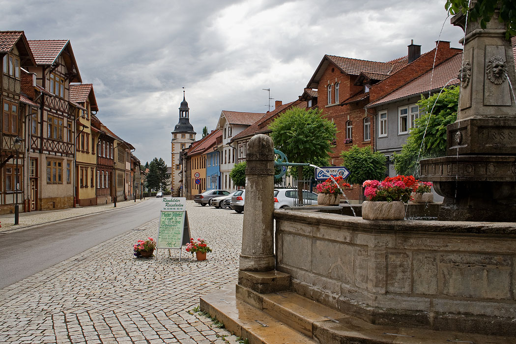 Im Stadtkern von Roemhild - Roemhild ist eine Kleinstadt im Landkreis Hildburghausen im fraenkisch gepraegten Sueden Thueringens. Die ehemalige Residenzstadt des Herzogtums Sachsen-Roemhild ist Mitglied und Sitz der Verwaltungsgemeinschaft Gleichberge. Roemhild liegt im Schutze der Gleichberge in der Region Grabfeld im Henneberger Land, direkt an der Landesgrenze zu Bayern. Waehrend des Zweiten Weltkrieges mussten 250 Kriegsgefangene aus Polen im Steinbruch des Basaltwerkes schwerste Zwangsarbeit leisten. Es muss von mindestens 300 Todesfaellen ausgegangen werden. Dazu gehoerten 70 schwerkranke Haeftlinge, die bei einem Todesmarsch im Maerz 1945 in einem Stollen des Gleichberges, dessen Eingang zugesprengt wurde, ihrem sicheren Tod ausgesetzt wurden. Auf dem Staedtischen Friedhof und am Osthang des Grossen Gleichberges ruhen 169 Opfer, an die ein Mahnmal auf einem Ehrenhain erinnert. Nach dem Zweiten Weltkrieg wurde die Stadt durch den Ausbau des Toepferhandwerkes und die Entstehung der groessten Handtoepferei Europas (Toepferhof Gramann) bekannt. Die Gleichberge sind ein kleiner und inselbergartig aufragender Mittelgebirgszug im suedwestlichen Teil von Thueringen in Deutschland. Sie sind die imposantesten Zeugen der tertiaeren vukanischen Aktivitaet der Heldburger Gangschar, die sich von hier ausgehend einst bis suedlich des Mains zog.Die Gleichberge, die hauptsaechlich aus den vulkanischen Basalt-Kegeln des Grossen Gleichbergs (679 m ue. NN) im Sueden und des Kleinen Gleichbergs (642 m ue. NN) im Norden bestehen, befinden sich im Landkreis Hildburghausen zwischen dem thueringischen Hildburghausen und dem fraenkischen Bad Koenigshofen. Sie liegen suedwestlich des Werratals, etwas oestlich von Roemhild. Westlich und nordwestlich der Gleichberge befindet sich die Rhoen, nordoestlich und oestlich der Thueringer Wald, suedoestlich liegen die Langen Berge, suedlich die Hassberge und suedwestlich befindet sich das Grabfeld, zu dem die Gleichberge gezaehlt bzw. als dessen hoechste Erhebungen betrachtet werden. Am Fuss des Grossen Gleichbergs befindet sich der Ort Gleichamberg.