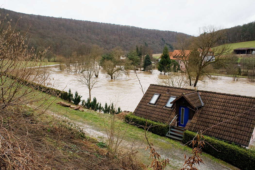 Fraenkische Saale - Hochwasser: Besonders betroffen von regelmaessigen Ueberschwemmungen der saalenahen Ortskerne sind Bad Kissingen, Westheim, Diebach, Graefendorf, Wolfsmuenster und Gemuenden, wie die Hochwassermarken an historischen Gebaeuden bezeugen - So wurde gegenueber einem Normal-Pegelstand von 1,55m in Wolfsmuenster die 5m-Pegelmarke seit 1969 (Aufzeichnungsbeginn) bereits sechsmal ueberschritten (Wasserstaende: 15 - 01 - 2011 - 604 cm, 03 - 01 - 2003 - 650 cm, 24 - 01 - 1995 - 582 cm, 08 - 02 - 1984 - 576 cm, 06 - 01 - 1982 - 572 cm, 06 - 02 - 1980 - 519 cm) - Bad Kissingen erlebt nicht selten Ueberschwemmungen mehrmals in einem Jahr - Jedoch sind im historischen Stadtkern Flutschutzmassnahmen durch den Bau von Wehren und Schutzplanken durchgefuehrt worden -