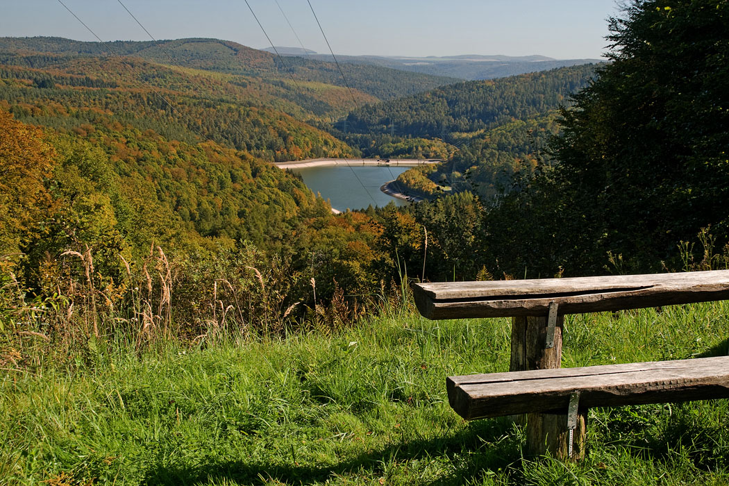 der Unterspeicher (236m) des Pumpspeicherwerkes Langenprozelten vom Hang des Gerberges auf dem Weg von Rupertshuetten zum Katharinenbild an der Sohlhoehe