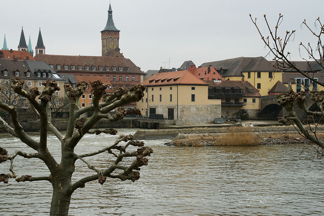 Alte Mainmuehle, dahinter Altes Rathaus Grafeneckart, links hinten der Kiliansdom