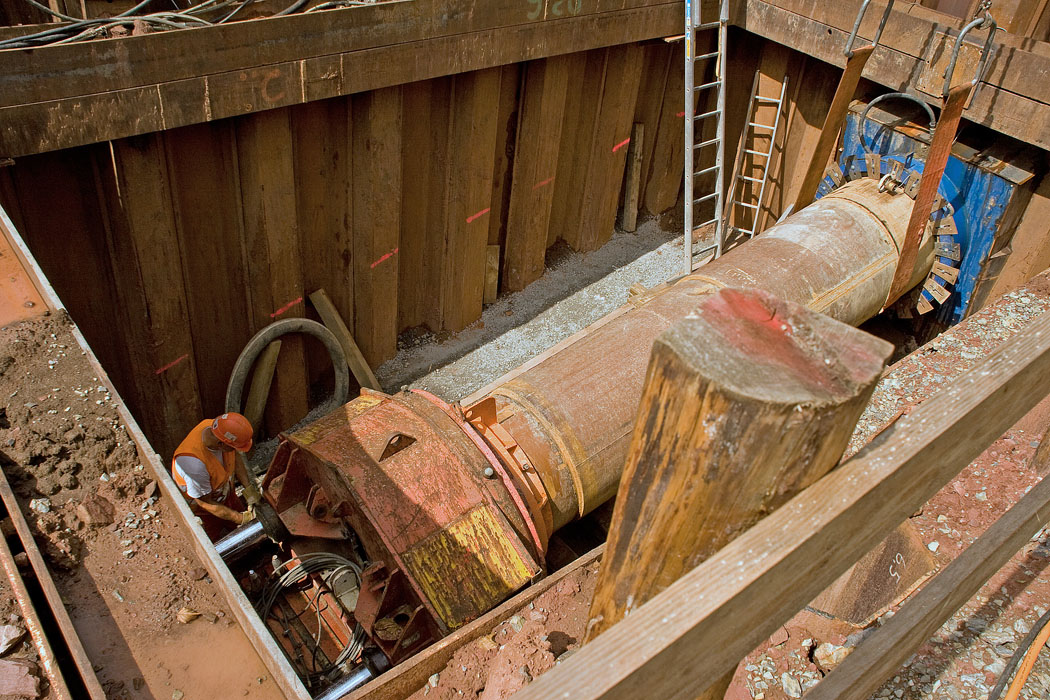 In dem sichtbaren Rohr dreht sich vorn der Bohrkopf - Dabei wird dieses Rohr mittels der zwei Hydraulikzylinder stets nachgeschoben - Ist die Bohrung vollendet, wird der Schlitten mit dem Bohrkopf zurueckgezogen und durch dieses Rohr das eigentliche hindurchgefuehrt