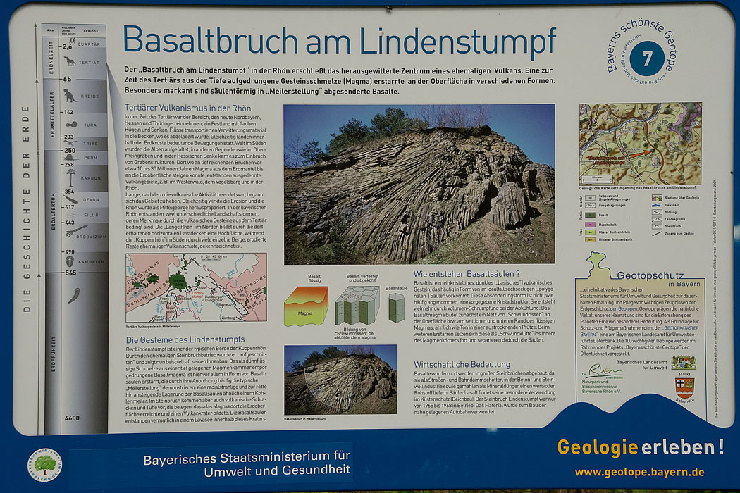 Der Lindenstumpf ist ein Berg noerdlich der Gemeinde Schondra und 500 Meter suedwestlich der Bundesautobahn 7 - Er hat eine Hoehe von 500 Meter ueNN und eine kraterfoermige Struktur, die durch den Abbau von Basalt entstanden ist - Das gesamte Areal mit etwa 9,8 Hektar wurde 1994 als Geschuetzter Landschaftsbestandteil ausgezeichnet - 2002 wurde der Lindenstumpf in die Liste der 100 schoensten Geotope Bayerns aufgenommen - Der Lindenstumpf wurde durch Vulkanismus gebildet - Durch den Steinbruchbetrieb wurde diese Basaltkuppe aufgeschnitten so dass die Basaltprismen im Inneren der ehemaligen Kuppe sichtbar wurde - Verwitterung und Abtragung der Gesteine hatten einen kegelfoermigen Foerderschlot freigelegt - Gut ausgebildete Basaltsaeulen stehen radialstrahlig und steigen zur Mitte hin an, aehnlich wie bei einem Kohlenmeiler - 1965 wurde am Lindenstumpf beim Bau der A 7 von Fulda nach Wuerzburg ein Basaltsteinbruch mit Aufbereitungsanlagen fuer Splitt und Edelsplitt eroeffnet - Innerhalb von zwei Jahren wurden etwa 1,8 Millionen Tonnen Basalt abgebaut und verarbeitet - Nach der Stilllegung 1967 wurde die Aufbereitungsanlage demontiert - Zurueck blieb eine kraterfoermige Struktur des Berges