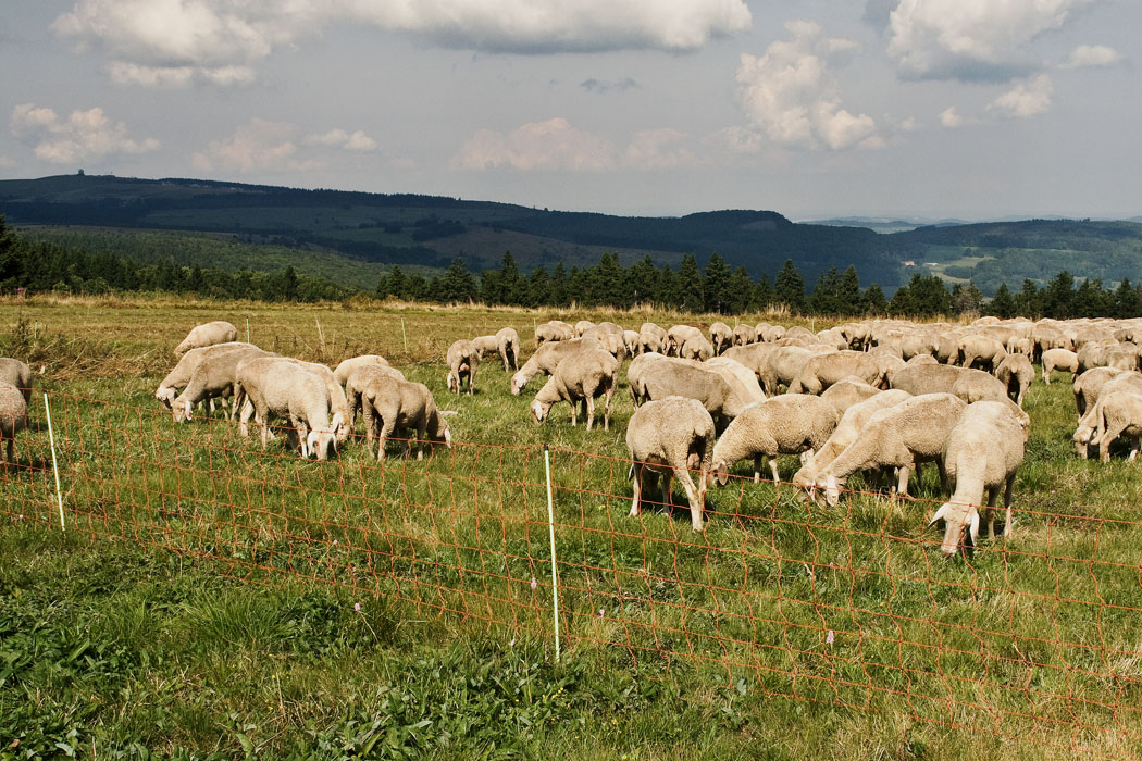 vorn weidende Schafe, die aber nicht die typischen Rhoenschafe sind