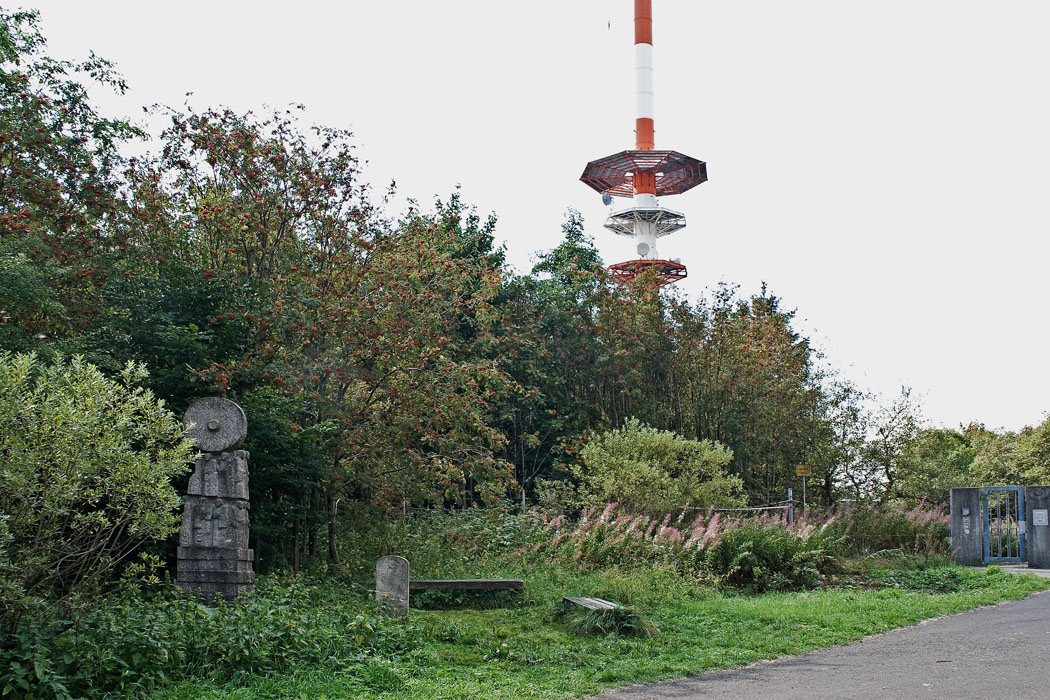 die Fernmeldeanlage der Telekom, links eine Skulptur der Deutschen Bundespost