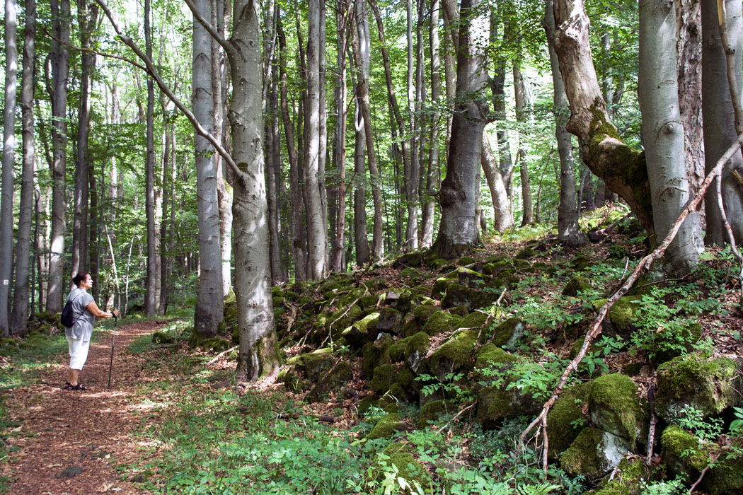 Die Rotbuche wird oft Mutter des Waldes genannt. Denn von Natur aus waere der groesste Teil Bayerns mit Buchenurwaeldern bedeckt. Sie ist infolge ihrer hohen Schattenvertraeglichkeit und ihres starken Kronenausbaus die konkurrenzkraeftigste Baumart in unserern Waeldern. Gegenueber anderen Baumarten tritt sie lediglich auf zu trockenen, zu nassen und zu felsigen Standorten zurueck. Auch hier am Loesershag bestimmt die Buche ausser in blockschuttueberlagerten Gipfelbereichen weitgehend das Waldbild. Sie erreicht Hoehen, je nach Standort, zwischen 30 bis 40 m. Ihr Wachstum haelt hierbei bis ins hohe Alter unvermindert an. Kennzeichnend fuer die Buche ist ihre duenne, glatte, auch im hohen Alter kaum verborkende Rinde.