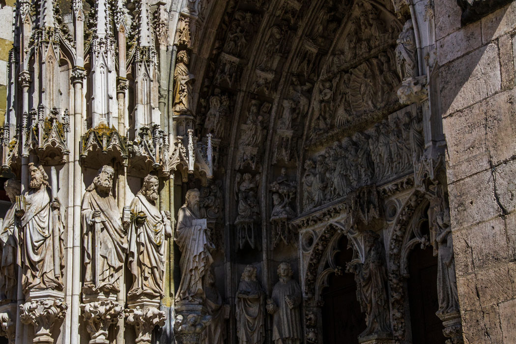 Regensburg - Dom St. Peter: Als ab 1200 die neuen Formen der franzoesischen Gotik auch in Deutschland Einzug hielten, bedeuteten das eine architektonische Revolution. Niemals zuvor hatten sich Kirchen konstruieren lassen, die solche Hoehen erreichten (Regensburger Domtuerme: 105m, Hoehe des Mittelschiffs: 31,85m), deren Innenraeume mit derart weit gespannten Gewoelben oben abschlossen und deren Fenster nicht nur beeindruckend gross, sondern auch in ungekannter Farbpracht leuchteten. Es verwundert nicht, dass die mittelalterlichen Menschen in diesen Kirchen ein Abbild des Paradieses, des himmlische Jerusalem, auf Erden erblickten. - Zu diesem Zeitpunkt ist die Stadt Regensburg politisch und wirtschaftlich auf ihrem Zenit. Die treibende Kraft des Regensburger Domneubaus in gotischen Formen sind die wohlhabenden Patrizierfamilien der Stadt und die Bischoefe, die haeufig jenen Familien entstammten. In ihren Augen muss der alte Dom hoffnungslos veraltet gewirkt haben und so beginnt man in den 1270er Jahren mit dem Neubau. Das heutige Erscheinungsbild des Domes ist gepraegt durch den dreigeschossigen, komplett durchfensterten Innenraum und der maechtigen westlichen Zweiturmfassade aussen. Damit entspricht der Regensburger Dom als einziger Bau oestlich des Rheins dem klassischen Schema der franzoesischen Kathedralen. Wahrscheinlich war es der 1283 erstmals erwaehnte ,,Meister Ludwig Steinmetz,,, der in Frankreich geschult, den Plan des Regensburger Domes entwickelte. Nach 250jaehriger Bauzeit war der Dom am Ende des Mittelalters im Wesentlichen fertiggestellt. Anfang des 16.Jahrhundert wurde der Dombau mit den noch unvollendeten Tuermen schliesslich eingestellt. Verantwortlich war dafuer u.a., dass der anfaengliche Wohlstand der Stadt waehrend der Bauzeit immer mehr zurueckgegangen war und der Stadt der Ruin drohte. - Seine authentisch mittelalterliche Wirkung verdankt der Regensburger Dom auch seinem in Deutschland einzigartigem Bestand an mittelalterlicher Glasmalerei.