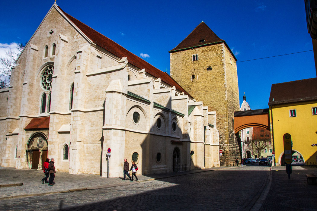 Regensburg - Dompfarrkirche St. Ulrich: Die ehemalige Dompfarrkirche St. Ulrich ist eine Kirche und ein Dioezesanmuseum in Regensburg. St. Ulrich in Regensburg wurde im 13. Jahrhundert errichtet. Der Kircheninnenraum ist mit Fresken ausgeschmueckt, die zwischen dem 13. und 16. Jahrhundert entstanden sind. 1824 wurde die Kirche profaniert. Nach einer grundlegenden Renovierung wurde sie 1986 erneut konsekriert. Sie dient seither den Bistumsmuseen Regensburg als Ausstellungsraum und ist zugleich Stationskirche des Regensburger Domkapitels. Im heutigen Museum sind mittelalterliche Goldschmiedekunst wie auch Exponate aus der Renaissance, dem Barock und dem Rokoko zu sehen