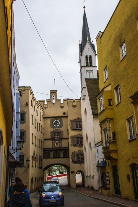 das Brucktor - Als Eingangstor an der Innbruecke ist das Brucktor seit 1338 urkundlich nachgewiesen. Es wurde im Laufe der Jahrhunderte wiederholt umgebaut. An der Innfront befinden sich Wandmalereien aus dem Jahr 1568. Sie zeigen zum einen zwei geharnischte Maenner (sogenannte Scharwaechter) mit dem bayerischen und dem Wasserburger Banner und zum anderen darueber Jupiter auf einem Adler mit Lilienstock, Blitz und Zepter.