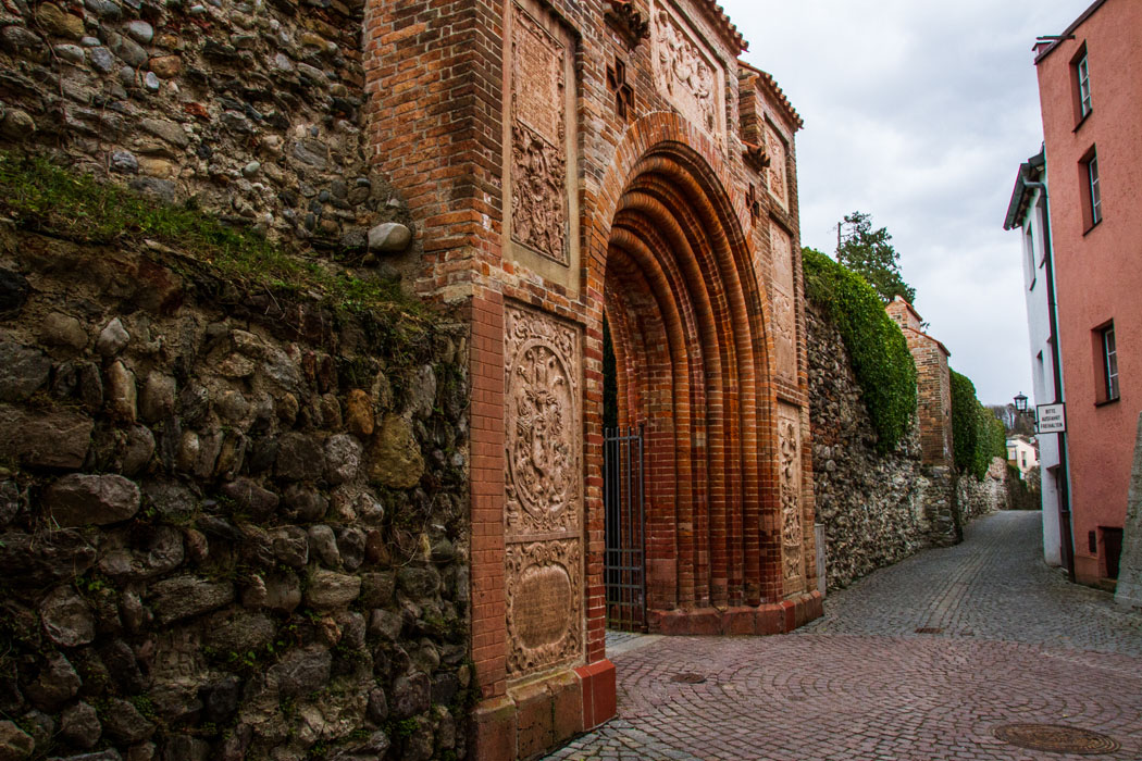 Alte Stadtmauer - Im Westen steht das letzte noch sichtbare Stueck der alten Stadtmauer. Sie wird unter anderem von dem altstadtzugewandten Portal des Friedhofes durchbrochen. Das Eingangstor zu dem seit 1544 hier befindlichen Friedhof wurde 1855 unter Verwendung wertvoller, alter Marmorepitaphien neu errichtet.