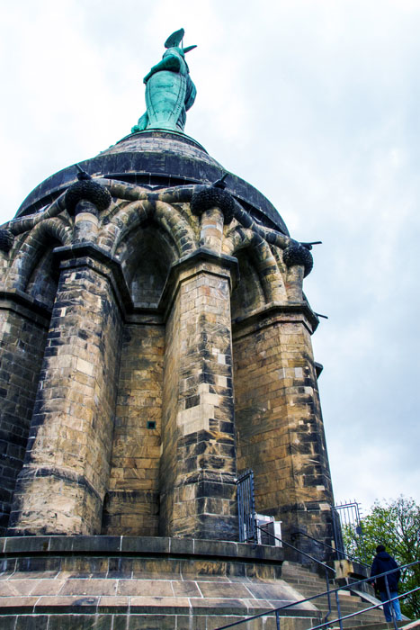 Hermannsdenkmal - Das Hermannsdenkmal ist eine Kolossalstatue in der Naehe von Hiddesen suedwestlich von Detmold in Nordrhein-Westfalen im suedlichen Teutoburger Wald. Es wurde zwischen 1838 und 1875 nach Entwuerfen von Ernst von Bandel erbaut und am 16. August 1875 eingeweiht. Das Denkmal soll an den Cheruskerfuersten Arminius und die sogenannte Schlacht im Teutoburger Wald erinnern, in der germanische Staemme unter Fuehrung von Arminius (Lateinisch, auf Deutsch: Hermann, Armin und auch Irmin Alt-Niederdeutsch) den roemischen Legionen unter Publius Quinctilius Varus im Jahre 9 eine entscheidende Niederlage beibrachten. Mit einer Figurhoehe von 26,57 Metern und einer Gesamthoehe von 53,46 Metern ist es die hoechste Statue Deutschlands und war von 1875 bis zur Erbauung der Freiheitsstatue 1886 die hoechste Statue der westlichen Welt.