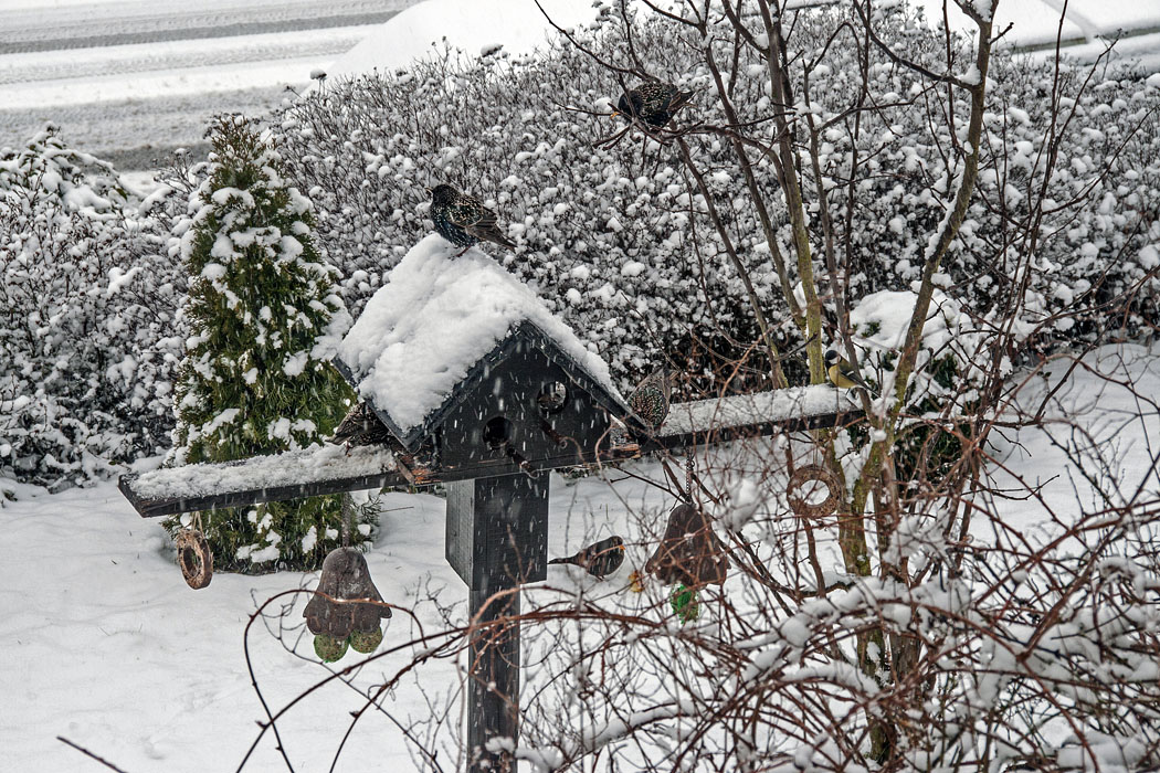 Heftiger Betrieb an und vor unserem Vogelhaus