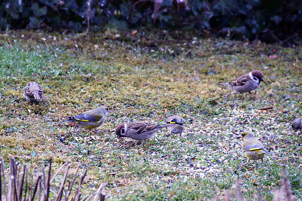 Spatzen, Gruenhaemfling, Stieglitz, Feldsperlinge