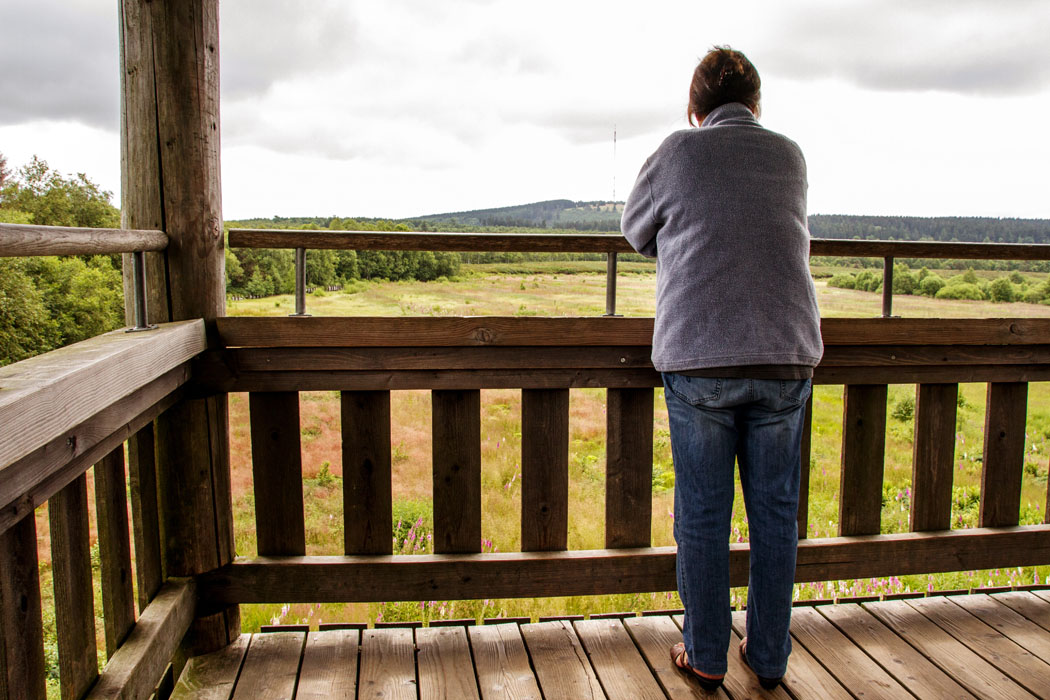 Blick ueber die vielen Blumen auf dem abgebauten Moor - dahinter der Heidelstein