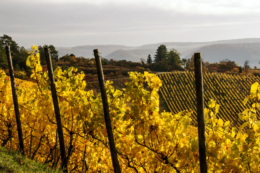 Herbststimmung bei prachtvoller Laubfaerbung am Ofentaler Berg.x.x.x.Weinberge ueberm Eschental.x.x.x.Ofentaler Berg (342m) - noerdliche Begrenzung Hammelburgs mit etlichen Weinbergen am Hang