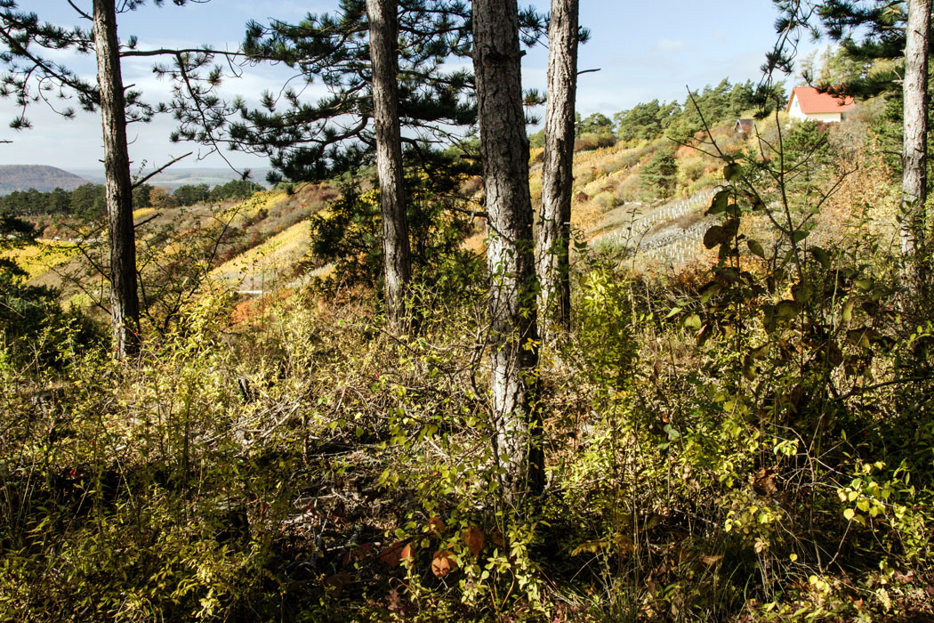 Herbststimmung bei prachtvoller Laubfaerbung auf dem Ofentaler Berg.x.x.x.Blick zu den Weinhaengen am Urbanusweg.x.x.x.Ofentaler Berg (342m) - noerdliche Begrenzung Hammelburgs mit etlichen Weinbergen am Hang