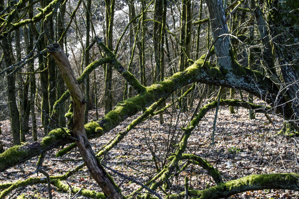 Spaziergang am Hohen Haupt.x.x.x.ueberall hat sich viel Moos an den Baeumen gesammelt.x.x.x.Hohes Haupt' (368m) - das ist ein Auslaeufer noerdlich der 'Gans' (415m) am Sodenberg - Die 'Gans' (415m) am Sodenberg ist ein hervorragender Aussichtspunkt fuer Ausblicke in die Hochrhoen, das Tal der Fraenkischen Saale, auf Hammelburg und die Anhoehen des Unterfraenkischen Berglandes - Dort befinden sich auch zwei Gedenksteine des Rhoen-Klubs, ein groesserer fuer die Verstorbenen bis 1988, ein kleinerer fuer die Eingliederung des Sodenbergs in die Region 'Rhoen' im Jahr 1885