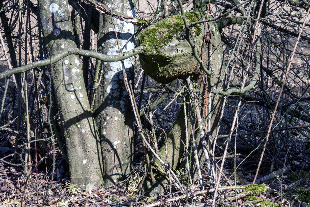 Spaziergang am Hohen Haupt.x.x.x.sonderbarer Baum - wie ein Kopf.x.x.x.Hohes Haupt' (368m) - das ist ein Auslaeufer noerdlich der 'Gans' (415m) am Sodenberg - Die 'Gans' (415m) am Sodenberg ist ein hervorragender Aussichtspunkt fuer Ausblicke in die Hochrhoen, das Tal der Fraenkischen Saale, auf Hammelburg und die Anhoehen des Unterfraenkischen Berglandes - Dort befinden sich auch zwei Gedenksteine des Rhoen-Klubs, ein groesserer fuer die Verstorbenen bis 1988, ein kleinerer fuer die Eingliederung des Sodenbergs in die Region 'Rhoen' im Jahr 1885