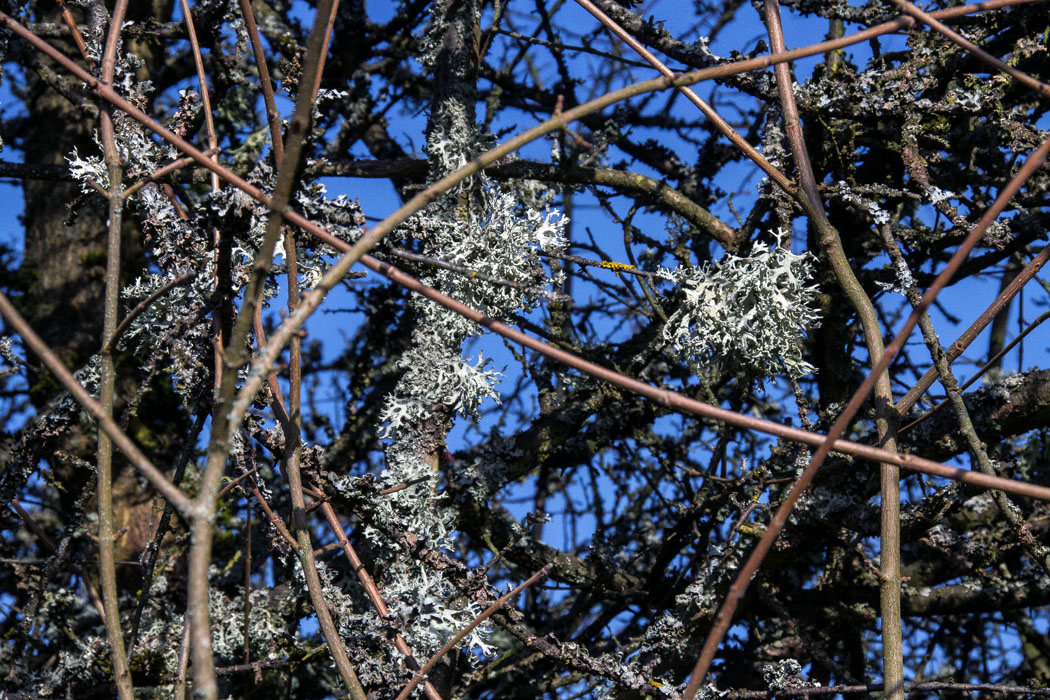 Spaziergang am Hohen Haupt.x.x.x.dichte Flechten an den Straeuchern.x.x.x.Hohes Haupt' (368m) - das ist ein Auslaeufer noerdlich der 'Gans' (415m) am Sodenberg - Die 'Gans' (415m) am Sodenberg ist ein hervorragender Aussichtspunkt fuer Ausblicke in die Hochrhoen, das Tal der Fraenkischen Saale, auf Hammelburg und die Anhoehen des Unterfraenkischen Berglandes - Dort befinden sich auch zwei Gedenksteine des Rhoen-Klubs, ein groesserer fuer die Verstorbenen bis 1988, ein kleinerer fuer die Eingliederung des Sodenbergs in die Region 'Rhoen' im Jahr 1885