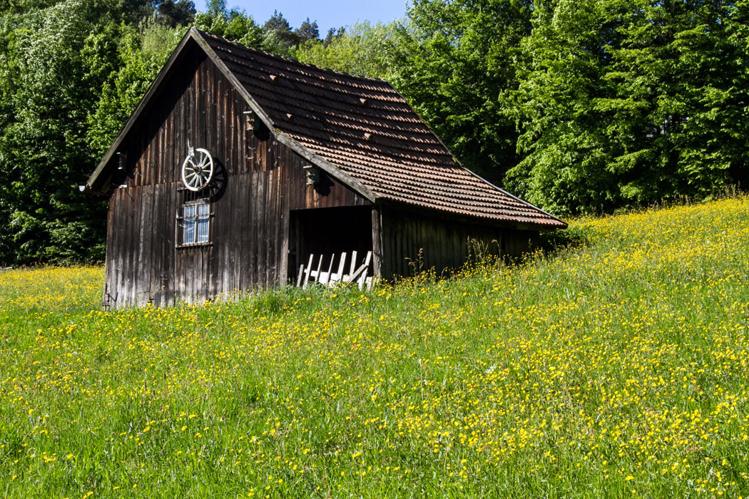 auf der Hinfahrt eine Scheune in der gelben Wiese