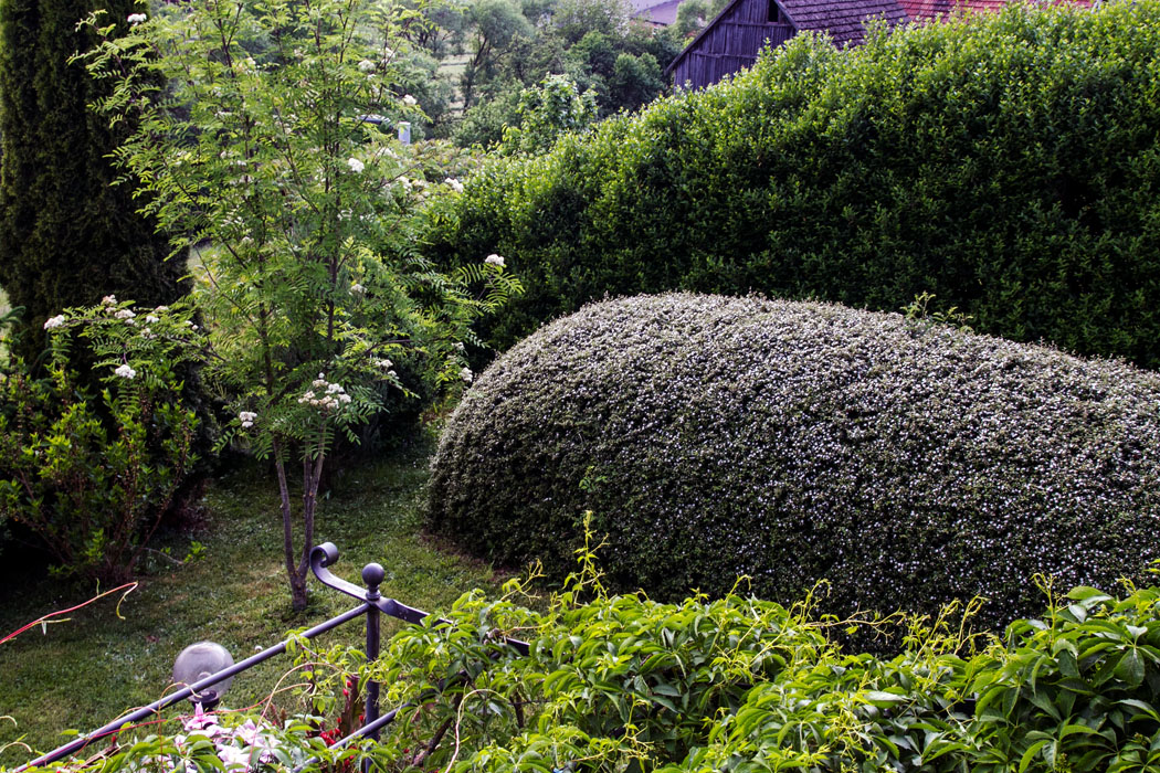 weriss bluehende Hecke bei der Eberesche