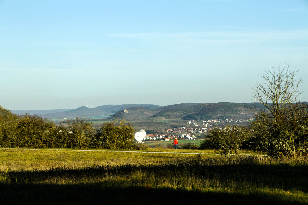 Fernblick zur Trimburg, unten im Tal die Erdfunkstelle Fuchsstadt bei Hammelburg mit ihren riesigen Antennen