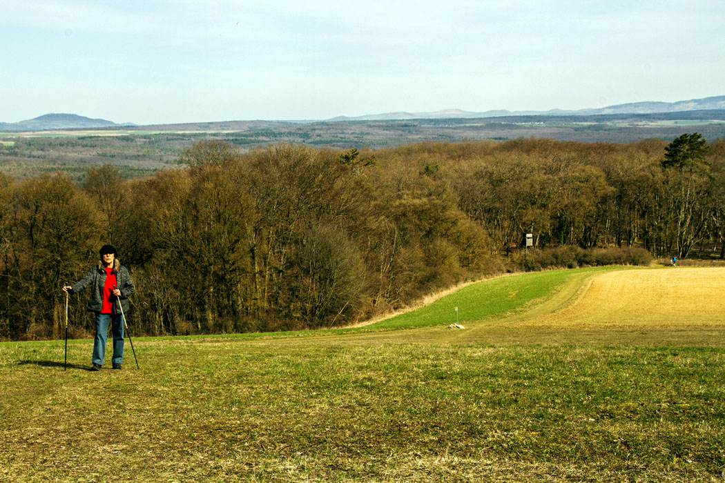 Jenny beim Aufstieg zur 'Gans' - hinten links der Dreistelz und Mottener Haube, rechts die Bergkette der Hohen Rhoen (Pilsterkopf, Dammersfeld, Eierhauck, Schwarze Berge)
