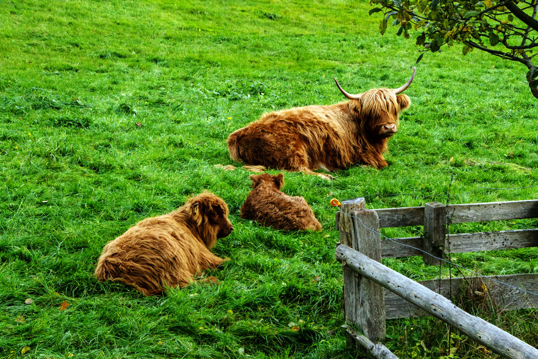 Rindviech mit langen Haaren und grossen Hoernen (Scottish Highland Cattles)