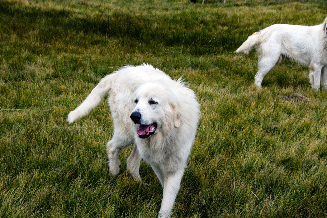 eine Herde Rhoen-Schafe mit zwei Huetehunden und einigen Ziegen
