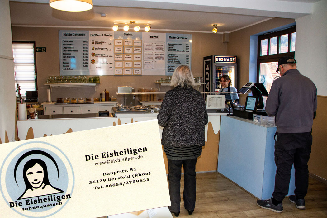 DIE EISHEILIGEN.Rhoener Premium-Eis=.Wir stellen Premium-Eis her, das puren und hochwertigen Genuss bietet.fuer moeglichst viele Menschen_ Dabei legen wir grossen Wert auf Regionalitaet, Saisonalitaet und Nachhaltigkeit_ Unsere Philosophie - Weniger ist mehr_ Durch Reduktion und hoechste Qualitaet tragen wir nicht nur zum Umwelt- und Klimaschutz bei, sondern schaffen auch ein tolles Geschmackserlebnis_ NATUeRLICH OHNE ZUSAeTZE - Unser Eis kommt ohne kuenstliche Aromen, Zusatzstoffe, Farbstoffe und Konservierungsmittel aus_ Wir verwenden nur Zutaten, von denen wir zu 100 Prozt ueberzeugt sind_ Denn gutes Eis braucht keine Chemie.es lebt von natuerlichen, hochwertigen Zutaten! #ohnequatsch.REGIONAL UND FAIR - Das Epizentrum der Eisheiligen befindet sich in Gersfeld-Hettenhausen.umgeben von wunderschoener Natur, mitten im UNESCO-Biosphaerenreservat Rhoen_ 60 Prozt unserer Zutaten stammen direkt aus der Region_ Was wir nicht vor Ort bekommen, beziehen wir, wann immer moeglich, direkt vom Erzeuger_.ECHTES HANDWERK - Unser Eis entsteht in echter Handwerkskunst.mit Leidenschaft statt Fertigmischungen, mit Herzblut statt Zusatzstoffen_ Jedes Eis hat ein eigenes, perfekt ausbalanciertes Rezept, das wir immer wieder verfeinern_ Selbst unsere gebackenen Zutaten stellen wir mit viel Liebe selbst her_